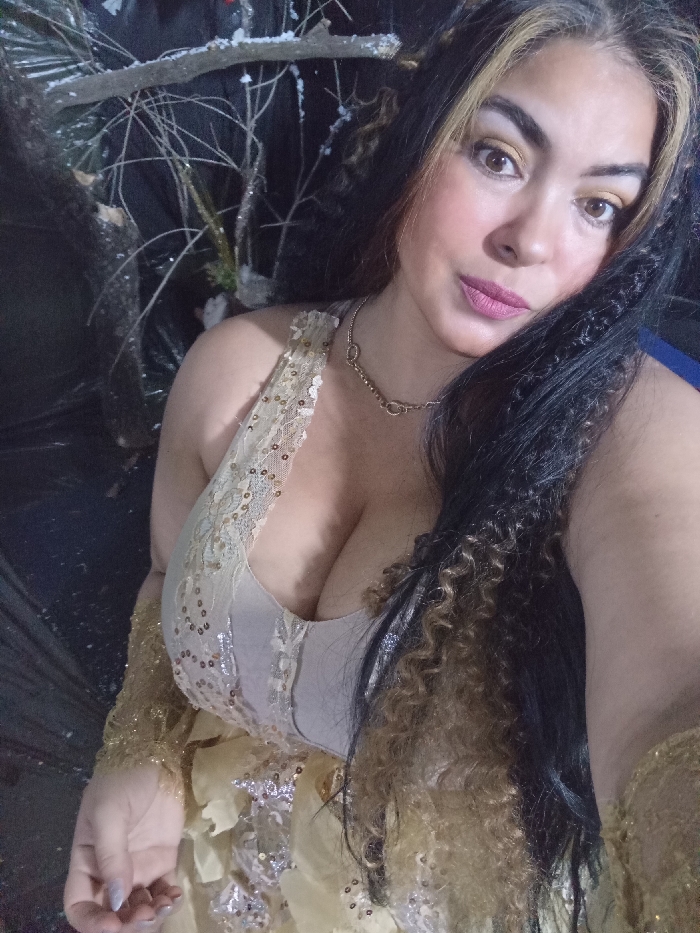 The image depicts a female subject, estimated to be in her 30s or 40s, posing for the camera in what appears to be a staged or decorated indoor environment. The location is Juan Griego, Venezuela. The woman has long, dark hair with blonde highlights, styled with distinct crimped or tightly curled sections. Her facial features include large eyes with prominent gold eyeshadow and dark liner, defined eyebrows, and matte pink lipstick. She is wearing a light gold or beige-colored, low-cut garment featuring lace, sequins, and possibly glitter, suggestive of formal or performance wear. A gold-toned chain necklace is visible. Her left arm is covered by a matching sequined or glittery sleeve/glove, and her left hand, displaying light-colored nail polish, rests near her waist. The background is dark and features bare tree branches, some appearing to be covered in a white substance resembling artificial snow or glitter, against a dark fabric or wall. The overall scene suggests a posed portrait in a themed setting.