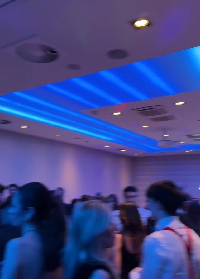 The video captures a lively indoor gathering, likely a social event or party, with a diverse group of people standing and mingling. The camera is at eye level, providing a view of the room from within the crowd. Most people are dressed semi-formally, with some in dresses and others in white shirts. The room is lit with vibrant blue lighting on the ceiling, accented by spotlights and a disco ball projecting patterns onto the wall. The ceiling also features ventilation units and a projector. The atmosphere appears festive. There is some audible music, and people seem relaxed and enjoying themselves, engaged in conversation.