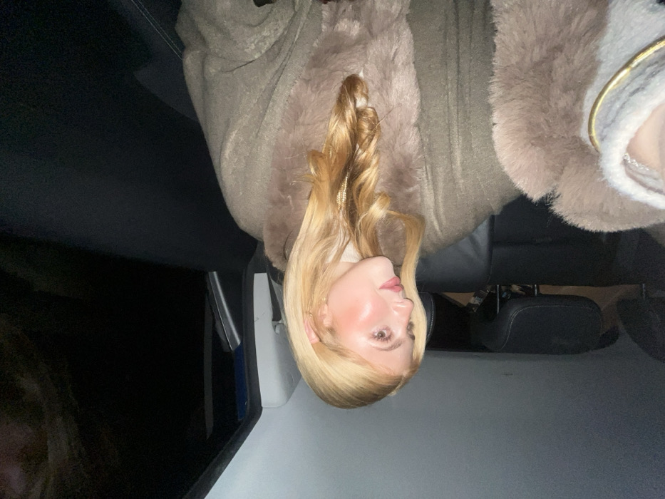 A blonde woman is seated in a car. She wears a coat with a fur-trimmed collar. Her hair is styled with curls. The car's interior is visible, including the dashboard and a seat. The lighting suggests an indoor setting, possibly at night. The perspective is slightly unusual, making the woman appear sideways within the frame.