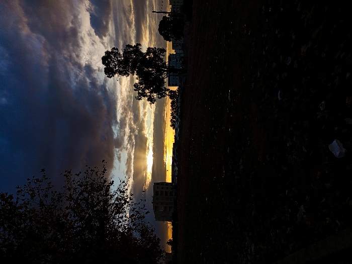 A dusk scene reveals a gradient sky from deep blue to golden hues. Wispy clouds streak horizontally across the view, with silhouetted trees and buildings punctuating the horizon. The foreground is shrouded in darkness, suggesting a field or ground cover in deep shadow. The buildings have a square construction style. A sliver of bright light bursts through the clouds, adding depth to the atmospheric view.