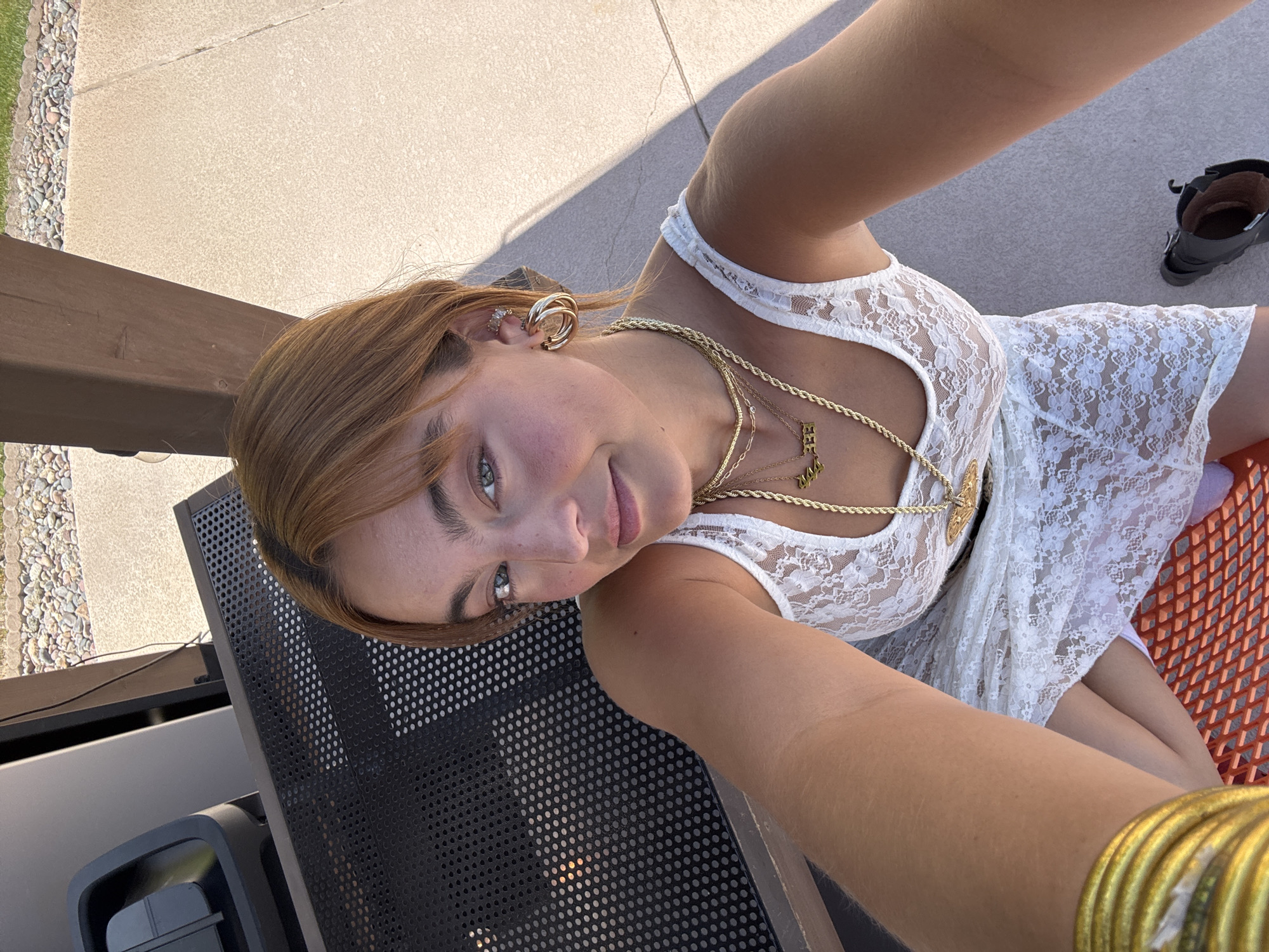 A young woman with fair skin and light brown hair takes a selfie outdoors in Rancho Mirage, United States. She is wearing a short, white, lace dress and multiple gold necklaces and earrings. The location appears to be a patio or deck with an orange outdoor chair and a black boot visible in the background. The surface is likely concrete.