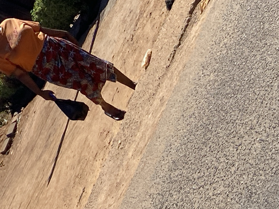 A pedestrian is depicted mid-stride on a dirt pathway adjacent to an asphalt road in Barakin Akawo, Nigeria