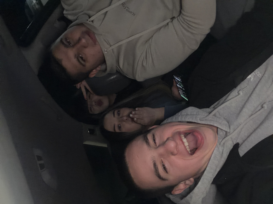 The scene depicts four individuals inside a vehicle, located in the city of Beloslav, Bulgaria. The vehicle's interior is dark, suggesting night conditions or a dimly lit environment. In the foreground, a young adult male with short dark hair is prominently featured, wearing a grey hooded sweatshirt with an Adidas logo on the sleeve and a dark jacket. His mouth is wide open in an exaggerated expression, indicative of laughter or a yell, and his face is brightly illuminated. Behind him, a young adult female with long dark hair is partially visible, wearing a dark blue top. She holds her left hand near her mouth, displaying a surprised or amused expression, and is holding a smartphone with an illuminated screen displaying various app icons. Further back and slightly to the right, another young adult female with short dark hair and bangs is partially obscured. She is shown with pouting lips and is making a 'peace' sign (V-sign) with her right hand. To the right of the frame, a second young adult male is visible, wearing a light beige hooded sweatshirt with "ICOND CO." text on the chest. He looks towards the camera with a neutral to slightly smirking expression. The individuals are posing for a photograph, likely a selfie, given the close proximity and informal expressions.