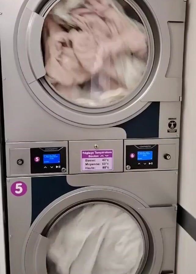 stack of two commercial-grade dryers in a laundromat setting. The top dryer contains a load of light-colored clothing that is tumbling inside the drum. The bottom dryer also has a load of light-colored clothes. Between the two dryers is a control panel that displays the temperature settings in French: Basse (low) at 40 degrees Celsius, Moyenne (medium) at 60 degrees Celsius, and Haute (high) at 80 degrees Celsius. The dryer on the left is marked with the number 5. The environment appears to be a clean, well-lit commercial space.
