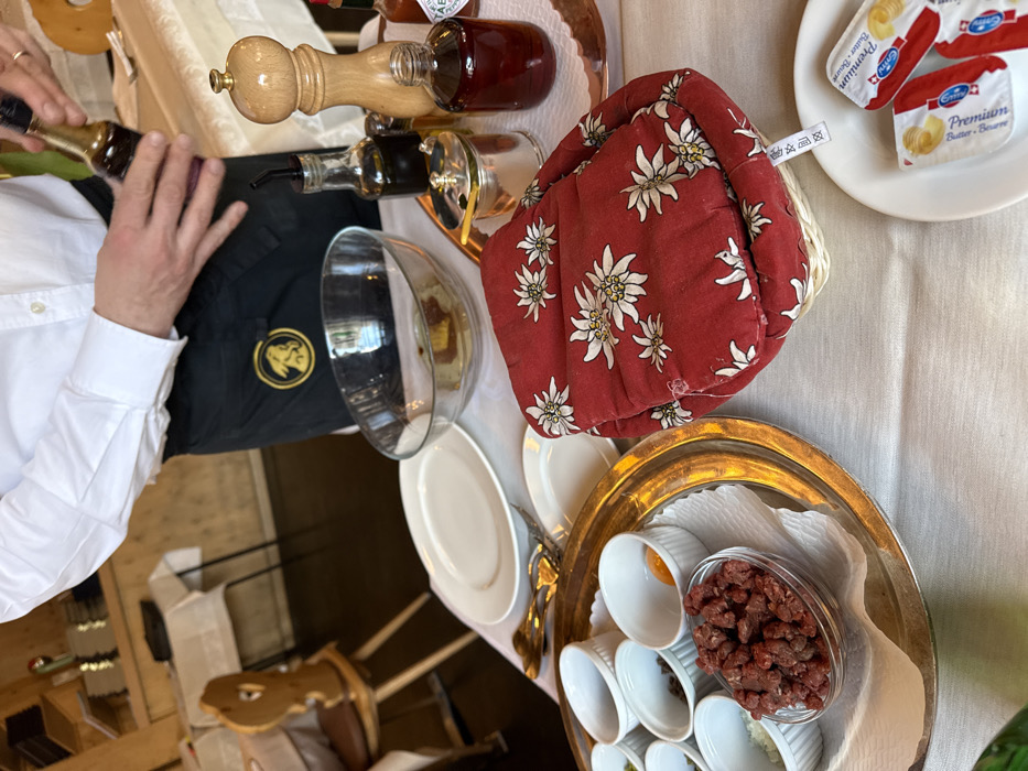 The image captures a tableside food preparation scene within a restaurant located in Sankt Moritz, Switzerland