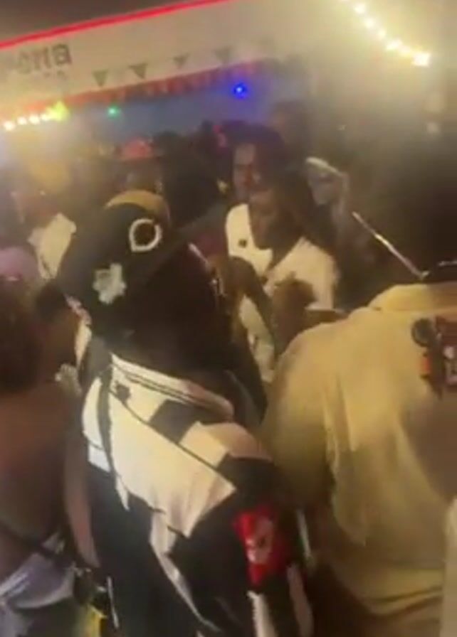 large group of people gathered at a place called "Arena Lounge." The lighting is provided by colorful string lights and neon signs. People are dressed in a variety of clothing styles. Some individuals are holding drinks, and there is a general sense of socializing and revelry. The environment appears to be an outdoor or semi-outdoor venue, possibly a club or event space.