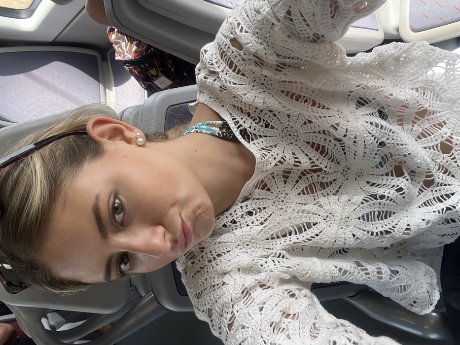 A young woman sits in an airplane seat, looking at the camera with a slightly displeased expression. Her light brown hair is pulled back. She wears a white, lace top with long sleeves, exposing a necklace on her neck. Sunglasses sit on her head. Behind her, there is the back of another airplane seat and a colorful bag. The lighting is bright, and the overall image is close-up.