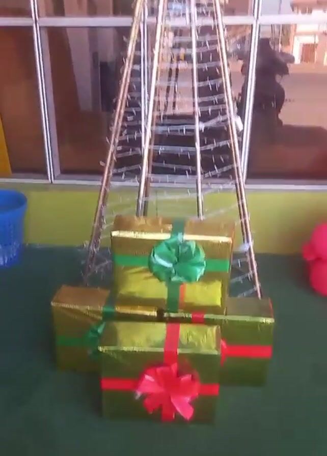 festive Christmas decoration outside a building. At the base is a collection of gold-wrapped gift boxes, each tied with a green or red bow. Above the gift boxes is a cone-shaped structure, built of metal rods and wrapped with white string lights. The top of the cone is decorated with a cluster of green and red balloons. The building behind the decorations has large glass windows that reflect the street outside. The window frames are orange and green. Red and green balloons also decorate the upper part of the building. The ground surrounding the decorations is green.