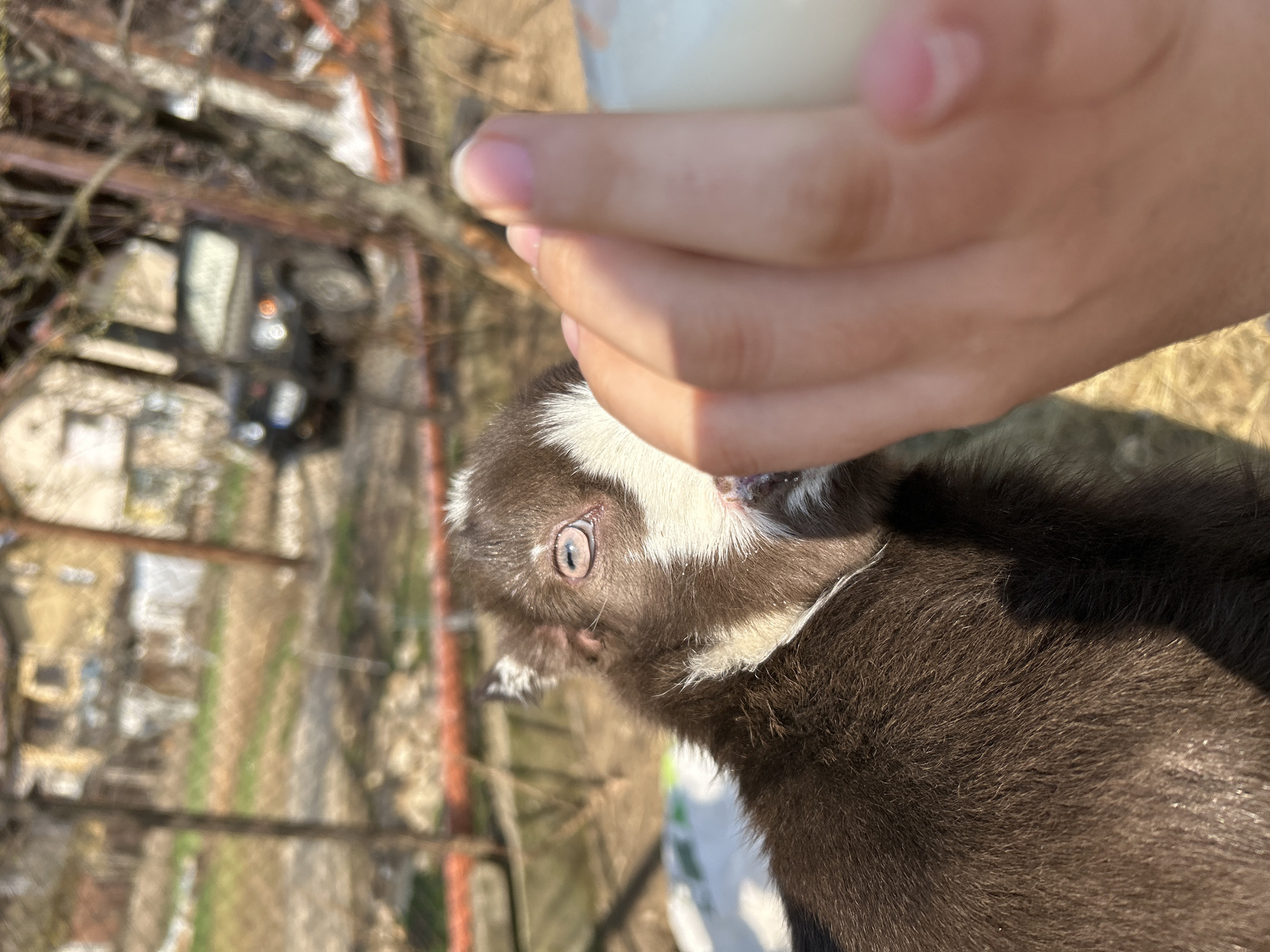 A close-up depicts a brown and white baby goat being bottle-fed. A person's hand is holding a bottle to the goat's mouth. The goat has a white stripe on its head and a white collar. The background is blurred, showing foliage and some blurry shapes resembling houses, metal structures, and possibly a car. The lighting appears bright and the photo is turned sideways.