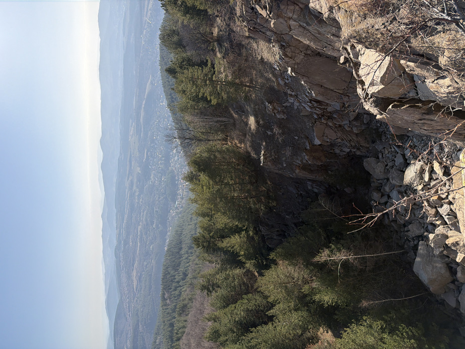 The image depicts a panoramic view overlooking the city of Kladnitsa, Bulgaria, from a high elevation point. In the immediate foreground, a steep, rocky cliff face of fractured, grey-brown rock dominates the lower right, descending sharply into a deep gully filled with fallen boulders and debris. Sparse, leafless branches protrude from the extreme foreground. The midground features a dense evergreen forest, primarily coniferous trees, covering undulating slopes that transition into the rocky gully. Patches of dry grass and scattered deciduous trees with bare branches are visible on less steep sections of the terrain. In the background, nestled within a valley surrounded by forested hills, lies the city of Kladnitsa, appearing as a cluster of residential and commercial structures. Beyond the city, successive layers of mountains extend into the hazy distance, exhibiting atmospheric perspective. The sky is clear and light blue, occupying the upper portion of the frame. The scene is illuminated by bright daylight, casting defined shadows. No individuals, animals, or specific actions or interactions are present in the image.