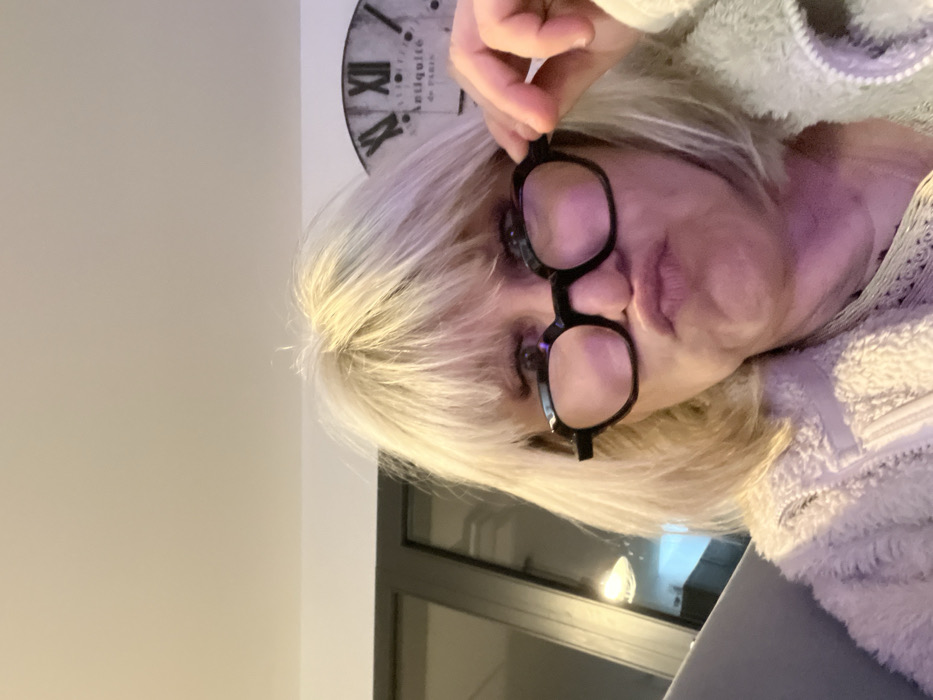 A woman with short, blonde hair frames her face with black, round glasses. She holds the glasses near her eye. Her complexion is fair. She wears a fuzzy white jacket. The background is a mix of light neutral tones and includes a glimpse of a clock. The image appears to be a close-up selfie.