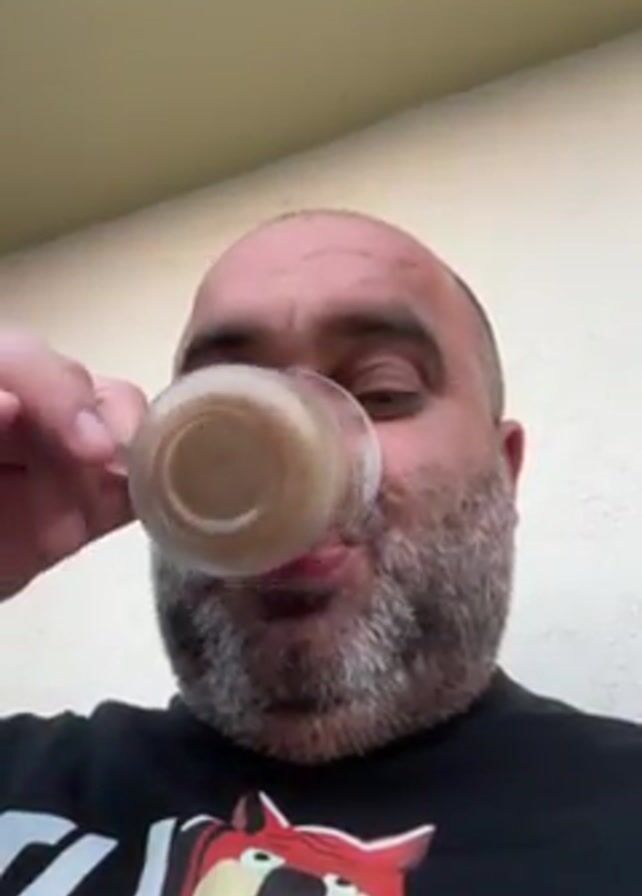 A man with a bald head and a graying beard drinks from a clear glass mug. The liquid inside appears to be a light brown color. He is wearing a black t-shirt with a cartoon character on it. He is outdoors, with a light-colored wall behind him. The camera is positioned below him, looking upwards.