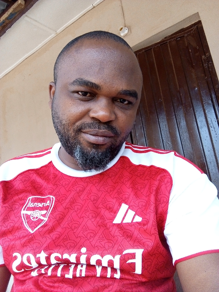 This image captures a close-up portrait of an adult male in Sabon Tasha, Nigeria. The subject, of dark complexion, has a shaved or closely cropped dark scalp and a dark, full beard with visible grey hairs predominantly on the chin. He is wearing a red and white short-sleeved athletic jersey. The jersey features a subtle, repeating 'A' pattern, a white Adidas logo on the right chest, a white 'Arsenal' club crest on the left chest, and the word 'Emirates' displayed in reverse below the crest, indicating a front-facing camera capture. The individual maintains a direct gaze towards the camera with a neutral facial expression. The background includes a textured, light beige wall on the left, a dark brown, vertically paneled wooden door on the right, and a white corrugated ceiling structure with a partial wooden beam visible at the top. A small white electrical fixture is mounted on the beige wall in the upper right quadrant.