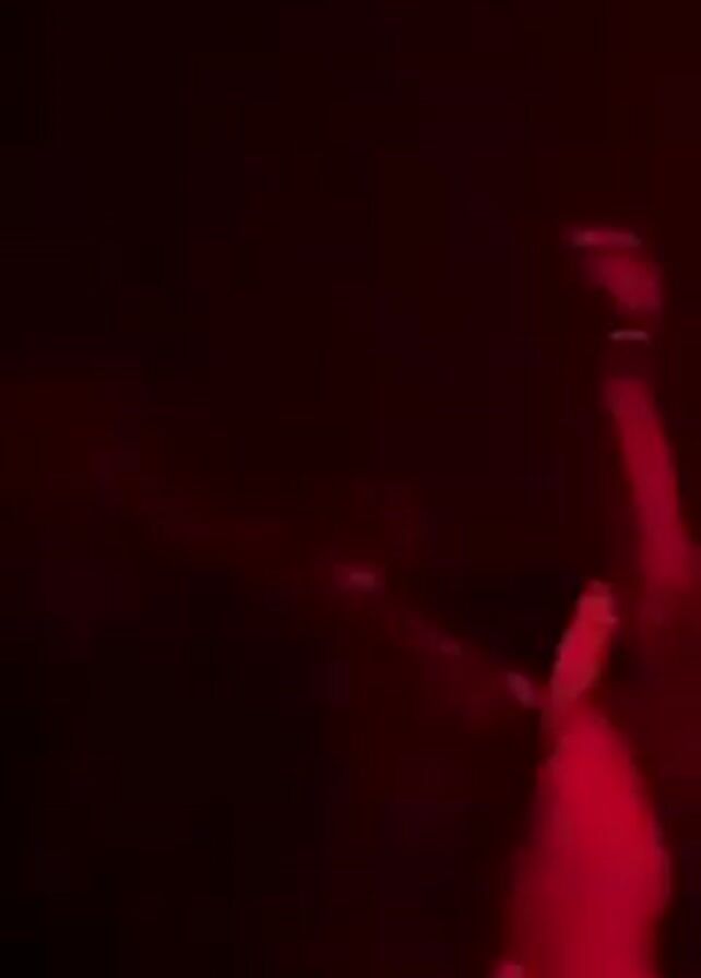 nightclub or party scene. Initially, the frame is dark with red lighting. Then a person is dancing at the front, barely visible with the lights. The camera view goes toward the stage where a DJ is performing. They are standing behind equipment, and the stage has a pixelated decoration. The lighting flashes red, and some other people are visible, watching the DJ.