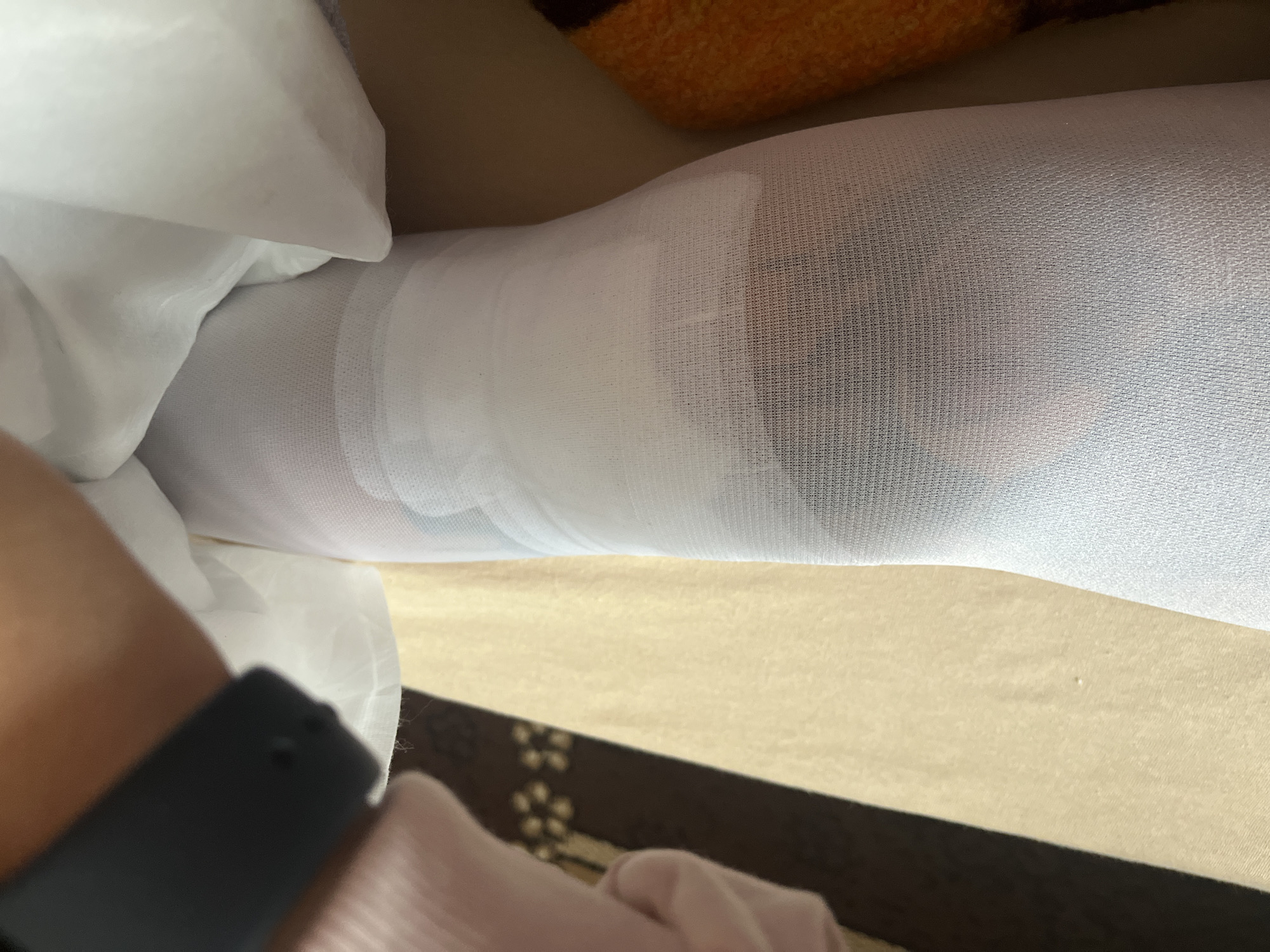 The image displays a close-up, downward perspective of a human lower leg, positioned as if at rest. The leg is encased in a white, semi-transparent compression stocking or similar medical garment. Beneath this sheer layer, a distinct white medical bandage or dressing is visible, wrapped circumferentially around the lower calf and ankle. A dark, indistinct area is faintly discernible through the sheer stocking on the lower part of the leg. To the left of the primary subject, a segment of another limb, consistent with a human arm, is partially visible. This limb is covered by a light pink fabric, and a dark, rectangular electronic device, identifiable as a smartwatch with visible buttons, is worn on the wrist. Below this arm, a dark brown floor covering featuring a repeating golden floral or geometric pattern, consistent with a rug or carpet, is present. The immediate central background beneath the leg consists of a light tan fabric, likely a bedsheet or blanket. To the right of the leg, a textured object displaying orange and brown hues, possibly another blanket or a cushion, is partially visible. The scene depicts an indoor environment. The image provides no specific visual cues to identify a precise location within the city of Balgarin, Bulgaria.