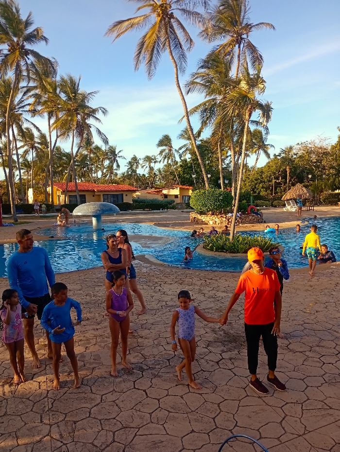 The image depicts an outdoor recreational area at a resort in Playa El Agua, Venezuela, during late afternoon or early evening. The scene is dominated by a large, irregularly shaped swimming pool with blue water, surrounded by numerous tall palm trees with green fronds. In the background, several single-story buildings with light-colored walls and red-tiled roofs are visible, interspersed among the trees. The sky is clear blue with minimal cloud cover. A mushroom-shaped water feature is located in the shallow end of the pool on the left. Towards the right side of the pool, a small hut with a thatched roof stands, with white sun loungers positioned nearby. A circular, raised garden bed with green foliage and a red life buoy is situated by the pool's edge on the right. The foreground consists of a textured, light-brown paved surface. Approximately 15-20 individuals, comprising adults and children, are present. In the foreground, an adult male wearing an orange short-sleeved shirt, black pants, and an orange cap walks barefoot on the paved surface, holding the left hand of a young girl wearing a light-colored patterned one-piece swimsuit. Behind them, a boy in a dark blue long-sleeved swim shirt and dark shorts, with goggles on his head, stands on the paved surface looking right. To the left, another adult male in a blue long-sleeved rash guard and dark swim shorts stands barefoot, looking right. Three children stand near this adult male: a girl in a pink patterned one-piece swimsuit, a boy in a blue long-sleeved shirt and blue shorts, and a girl in a purple one-piece swimsuit, all barefoot on the paved surface. In the pool's shallow end on the left, two women in dark swimsuits stand near the edge. Several other children are visible swimming or wading in various parts of the pool, and a boy in a yellow long-sleeved swim shirt walks along the far edge of the pool on the right.
