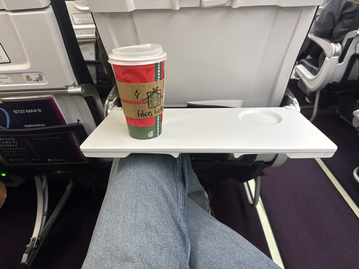 An indoor shot on a flight, showcasing an opened tray table with a Starbucks Christmas cup positioned on the left. A pair of legs, clad in light-wash denim, are visible beneath the table. A seat-back pocket is present to the left with B737 MAX9 label. The tray table features a circular indentation on the right. The back of the seat in front is plain white. The carpeted floor of the plane is dark purple with white stripes.