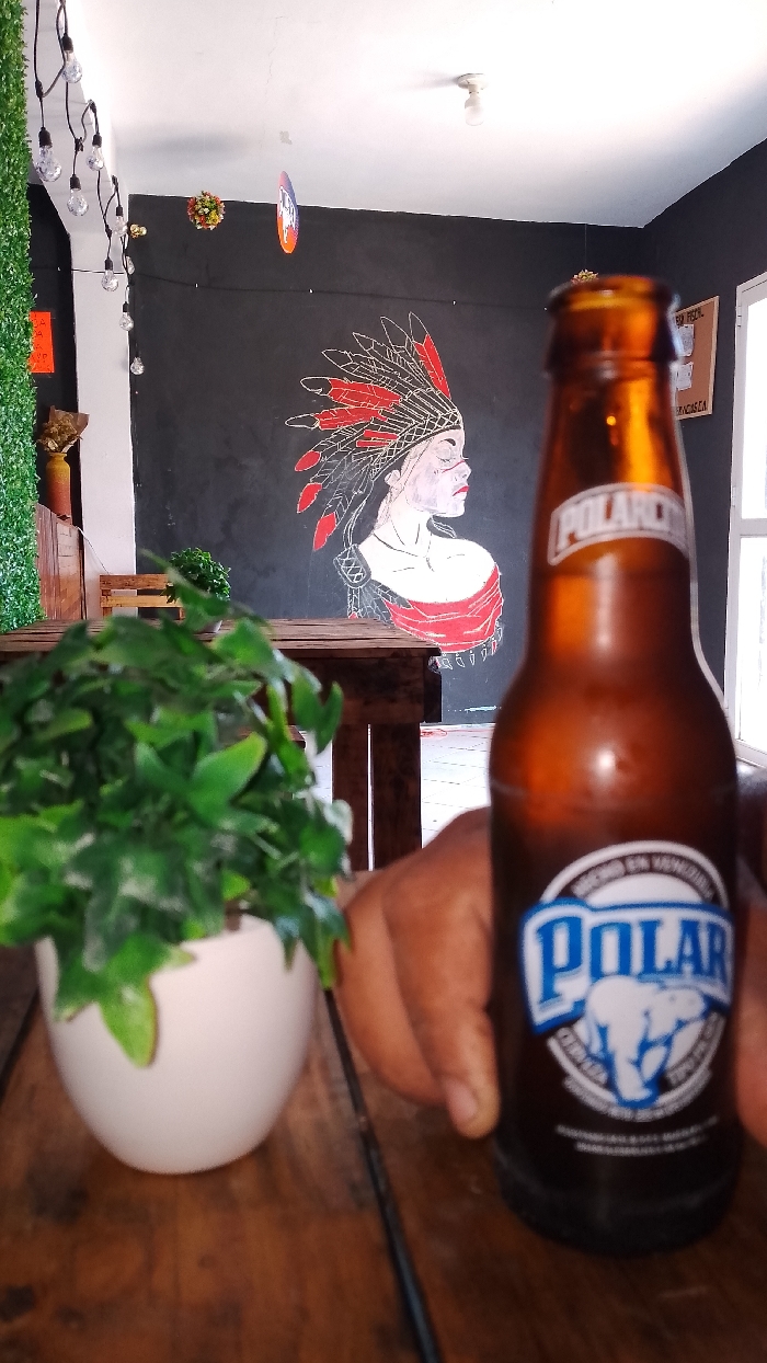 A close-up shot displays a Polar beer bottle with its blue and white label. A hand partly obscures the bottle's view. Beside it, a white pot holds a green plant. In the blurred background, a mural on a dark wall depicts a person in a Native American headdress, and a wooden pallet table is visible. Strings of decorative lights hang from the ceiling.