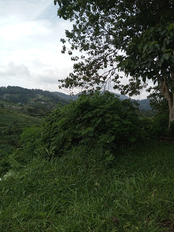 The image depicts a verdant, mountainous landscape in Ariyalai, Sri Lanka, under an overcast sky. The foreground features tall, dense green grass covering the lower half of the frame. In the midground, a large, bushy green plant dominates the center, with another tree trunk visible on the far right, its foliage extending into the upper right quadrant. The background reveals multiple layers of green hills and mountains, heavily forested, with some sections showing signs of terraced cultivation or agricultural fields. Small white or light-colored structures are faintly discernible on the distant hillsides. The sky is largely covered by clouds, indicating an overcast condition. No individuals or animals are visible within the scene.
