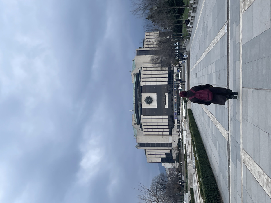 An outdoor wide shot captures the National Palace of Culture (NDK) in Sofia, Bulgaria, under an overcast sky
