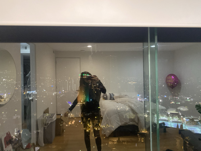 The image displays a night scene from a high-rise building in Interlomas, Mexico, featuring a prominent reflection of an indoor space superimposed over an illuminated cityscape. A person, identified by their reflection holding a smartphone to take the photograph, is centrally visible. The reflected interior reveals elements of a bedroom or studio apartment, including a bed with a white comforter and striped pillows positioned to the right. To the left, a large circular mirror is mounted on a light-colored wall, adjacent to a plain white door. A gray trash receptacle with a white liner rests on a light wood floor near the mirror. A fuchsia foil balloon, likely a "Happy Birthday" balloon, is visible to the right, near the window. The exterior view through the window presents a vast urban nightscape of Interlomas, characterized by numerous scattered lights from buildings and streets. Directly below the building, distinct circular illuminated structures and blue-surfaced tennis courts with white markings are visible. The overall scene captures the blend of the indoor environment's reflection with the expansive outdoor urban vista.