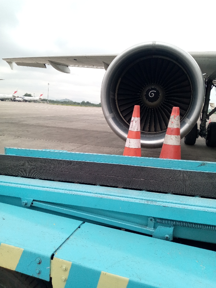 The image depicts a static scene on an airport tarmac in the city of Unknown, Nigeria. The foreground is dominated by the upper portion of a turquoise-blue baggage conveyor belt mechanism, featuring a black textured belt and faded yellow-and-white diagonal hazard stripes on its side. In the midground, the large, silver-grey turbofan jet engine of a commercial aircraft is prominent, with its multiple fan blades visible within the intake and a white spiral design encompassing the numeral "6" on the central spinner cone. Two orange and white striped traffic cones are positioned symmetrically in front of the engine intake. Part of the aircraft's white wing extends overhead, and its main landing gear tires are partially visible to the right of the engine. The background reveals a paved apron surface, with several other white aircraft featuring red tail markings parked in the distance. Low hills are visible on the horizon under an overcast sky. No individuals are present in the frame.