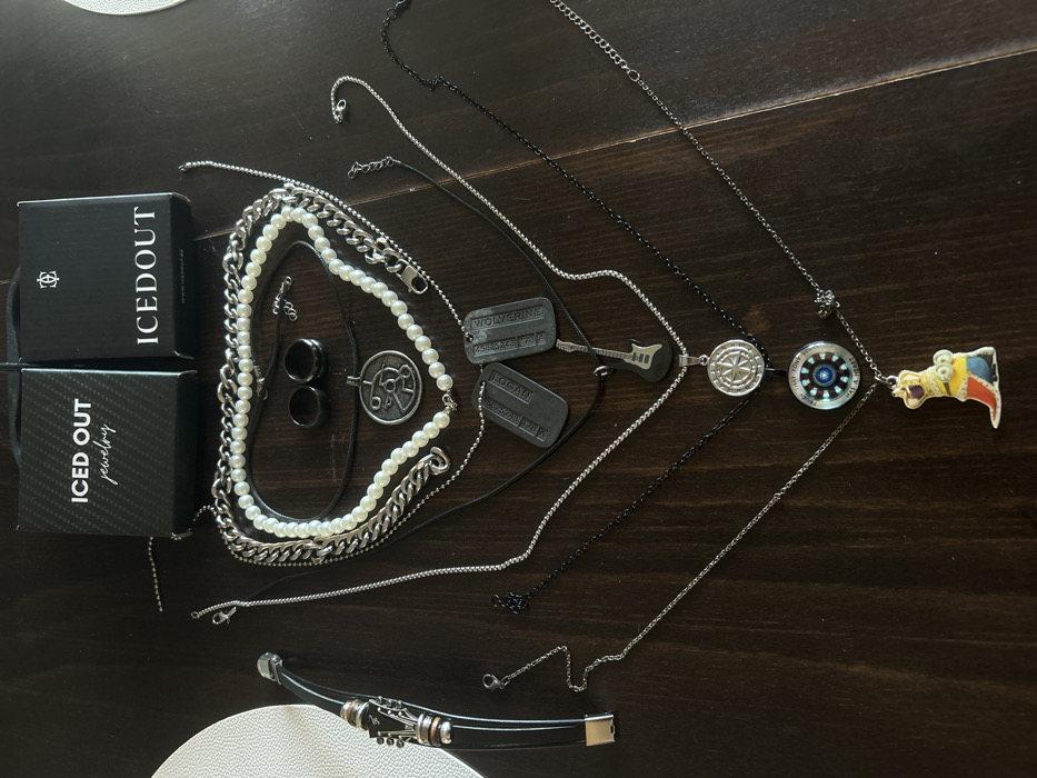 - "A flat lay photograph taken in Cherven Bryag, Bulgaria, displays an assortment of jewelry items arranged on a dark, polished wooden surface" by FM-OX6RM2, licensed under CC BY 4.0