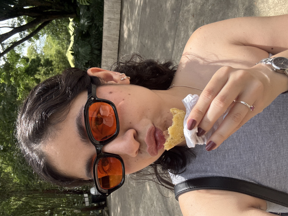 A female individual is depicted in a close-up outdoor photograph within the Area Metropolitana Centro Occidente (AMCO), Colombia. She possesses dark, wavy hair and wears black-framed sunglasses with orange-tinted lenses. Her attire includes a grey ribbed tank top, with the black strap of a bag visible over her left shoulder. Her left hand, bearing a silver watch on the wrist and a silver ring with a red stone on the ring finger, holds a partially consumed, yellowish fried food item, possibly an empanada, wrapped in white paper. Her fingernails are painted dark red. Multiple small silver hoop earrings are visible on her right ear. Her lips are pursed, indicating the act of eating. The background consists of dense green foliage and trees under bright daylight, with a concrete wall or structure present on the right side of the frame. The ground appears paved.