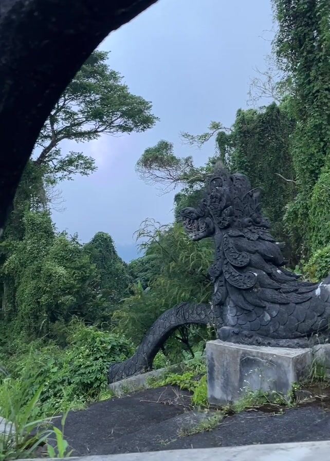 The camera shows a stone dragon statue in a lush, green outdoor environment