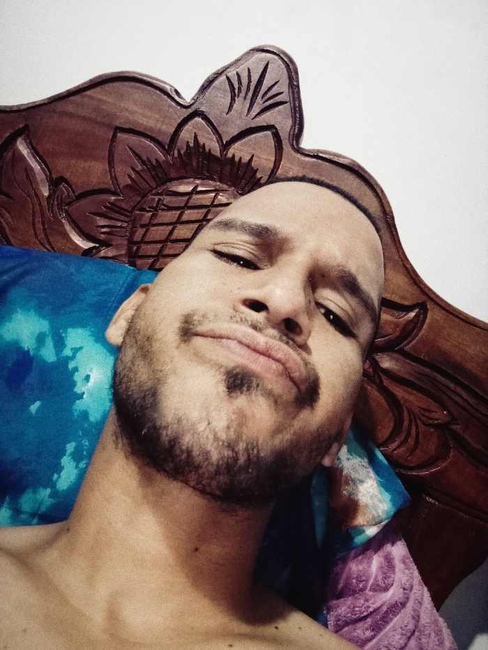 A close-up shot of a man lying down. He has short dark hair, stubble, and a soul patch. His expression is relaxed, with slightly pursed lips. He rests against a blue tie-dye pillow. Behind him is a dark wooden headboard featuring a carved sunflower design. The background is a plain white wall. The man's skin tone is warm and appears slightly oily. The overall lighting is soft and diffused.