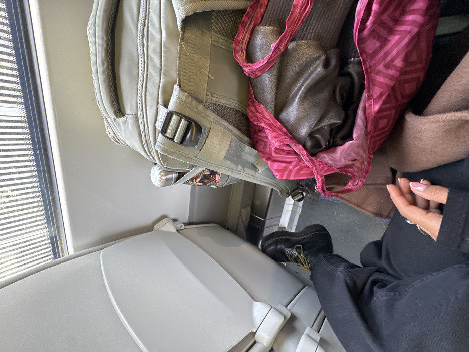 The scene depicts the interior of a train carriage, specifically within the city of Reigate and Banstead, United Kingdom. A person's lower left leg, clad in black trousers and a black boot with yellow laces, is visible in the mid-left. Their right hand, with French-tipped fingernails, rests in the foreground. To the right, a light olive-green backpack is situated, displaying a silver metal water bottle in a side compartment. Draped over the backpack are a pink geometric-patterned fabric, a dark brown leather-like garment, and a brown fuzzy textile. A light grey train seat back is partially visible to the upper left. A train window, partially obscured by vertical blinds or reflections, is present in the upper right background, indicating daylight outside.