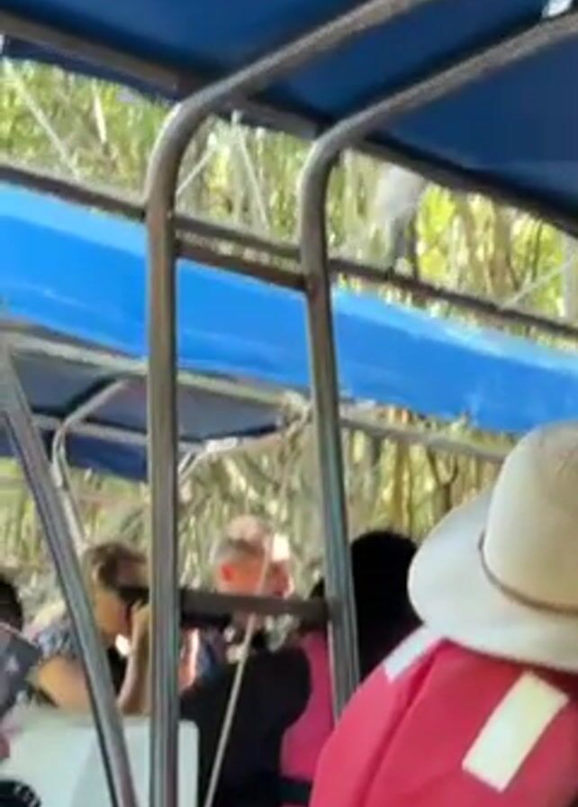 group of people on a boat, presumably on a tour through a wooded area, as suggested by the trees visible outside the boat's structure. The passengers are wearing life jackets. One notable detail is a monkey on the boat's frame. The view is somewhat obstructed by the boat's metal structure and the heads of the passengers.