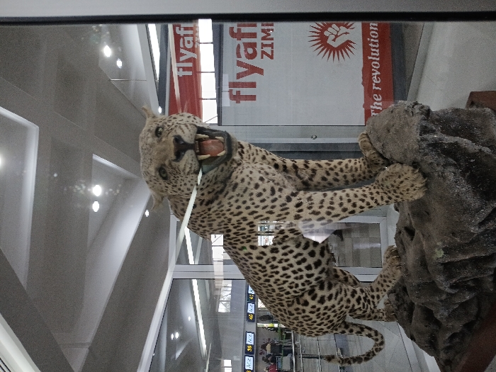 A taxidermied leopard, featuring a light brown coat with dark black spots, is depicted standing on a sculpted rock base inside a glass enclosure. Its head is slightly turned, mouth agape, revealing teeth. The scene is located within an airport terminal in Harare, Zimbabwe. This is evidenced by a prominent red and white sign in the background displaying "flyafri ZIMBABWE" with a "The revolution" slogan below a stylized fist, consistent with airline branding. Further in the background, a digital flight information board with partially visible numbers ("30", "40") is discernible. Indistinct human figures, appearing to be travelers, and general airport infrastructure like white walls, a patterned ceiling with recessed lighting, and glass partitions are visible throughout the spacious, well-lit environment.
