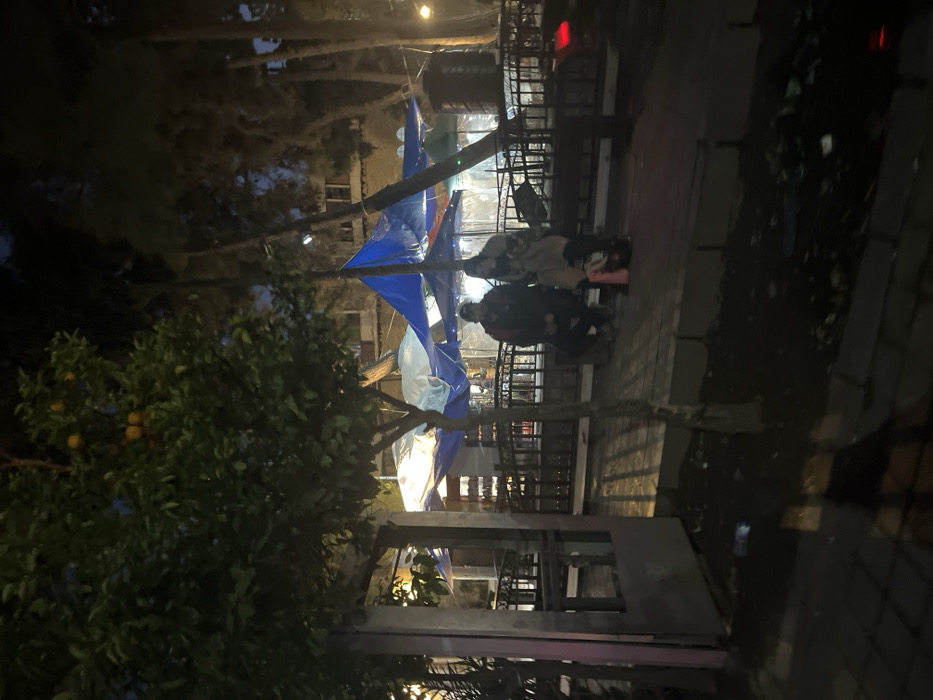 The scene captures an outdoor night environment within Sarouja Municipality, Syria. Two individuals are seated on a bench in the midground. The person on the left wears a dark jacket with a red stripe and a dark cap, while the person on the right wears a light-colored coat and dark headwear, with a reddish-orange bag situated near their feet. Behind them, multiple temporary structures are present, constructed from blue and translucent tarpaulins, internally illuminated. A dark metal railing extends across the midground. To the left, a fruit tree bearing green leaves and orange fruits is visible. The background consists of dark, tall trees silhouetted against the night sky, with a faint building discernible beyond them. The immediate foreground features a paved surface adjacent to an unkempt strip of soil containing scattered debris. Ambient and direct artificial light sources illuminate the scene.