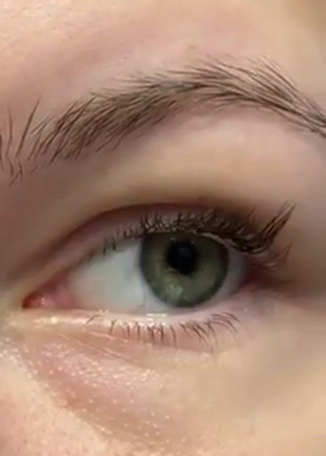 close-up of a woman's eye. The eye is green with a dark pupil. The eyebrow is brown and thin. The skin around the eye is light-colored. The eye blinks twice during the video.