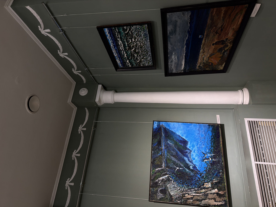 The image depicts an interior corner of an art exhibition space, likely a gallery or museum, located in Irkutsk, Russia. The walls are painted a muted sage green, topped with elaborate white neoclassical molding featuring a swag-and-bow design just below the ceiling. A prominent white fluted column with a decorative circular medallion on its capital stands in the corner. The ceiling is light-colored and contains a single circular vent or light fixture. Three framed paintings are displayed, suspended from a horizontal rail system by thin wires. 1. On the left wall, a large rectangular painting portrays a serene blue body of water reflecting mountains and sky, with a rocky shoreline on the left featuring a train tunnel entrance and tracks. Several white birds are depicted flying low over the water. A white information card below it is labeled in Cyrillic, reading "Озеро Байкал" (Lake Baikal), "Байкальский экспресс" (Baikal Express), and "Март 2023 г." (March 2023). A white horizontal air vent or grille is located on the wall beneath this painting. 2. On the upper right wall, a smaller, square-shaped painting features a textured, abstract rendering of dark blue, green, and white waves. 3. Below it, on the right wall, a rectangular painting shows a dramatic landscape with a dark, cloudy sky over a body of water, a brown rocky or sandy foreground, an orange tent pitched on the shore, and a single human figure. A small white object is visible on the water. A white information card below this painting is labeled "Байкальский экспресс" (Baikal Express). No individuals are visible in the scene. The architectural style and the thematic content of the paintings ("Lake Baikal," "Baikal Express") contextualize the location within Irkutsk, Russia, as an exhibition focused on regional subjects.