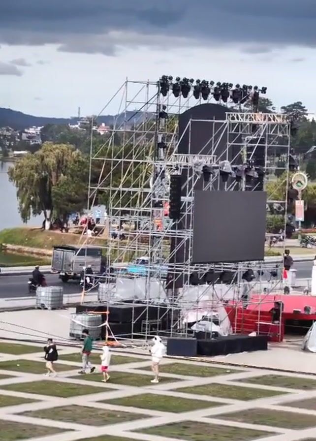 public square in what appears to be a town or city. A large stage is being constructed in the center of the square, framed by scaffolding and a large screen. A red carpet leads up to the stage. Several white tents are set up nearby, covered with tarps. There are several people walking around the square. One is pushing a shopping cart. The square is marked with a grid of light colored squares separated by dark grass strips. In the background, there is a body of water, possibly a lake, surrounded by a town nestled in green, wooded hills under a cloudy sky. Traffic is visible on the road behind the stage.