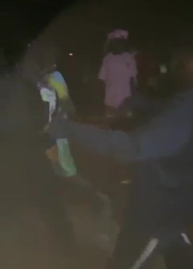 At night, a group of people stand together outside. The scene is dark and lit only by sparse and unclear lighting, which makes details difficult to discern. People move to the sound of music. The focus is on a man in the foreground wearing a dark sweatshirt and pants. He is facing away from the camera and moving his arms to the music. The other people in the group appear to be doing the same. The ground appears to be dirt or gravel, and there are trees visible in the background.