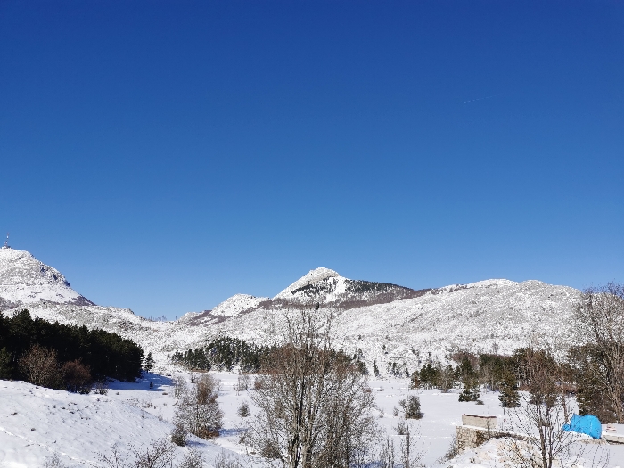 A wide-angle landscape photograph depicts a snow-covered mountainous terrain under a clear, bright blue sky in Mali Bostur, Montenegro