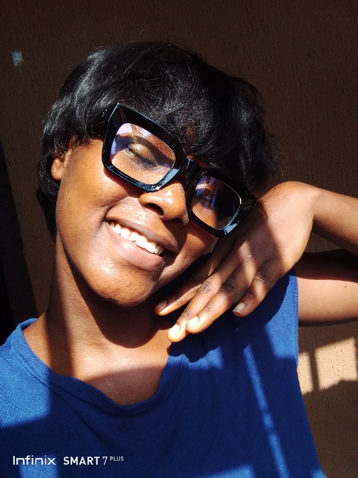 A dark-skinned individual, appearing female, is depicted in a close-up portrait, smiling broadly with closed eyes and visible white teeth. They wear a short, dark, bob-style haircut with bangs and prominent black-framed, cat-eye eyeglasses that reflect ambient light. The individual is wearing a plain, navy blue, crew-neck sleeveless top. Their right hand, with manicured nails, is positioned with fingers gently resting on the left side of their neck and shoulder area. Strong, directional sunlight illuminates the left side of their face and upper torso, creating sharp lines of light and shadow across their features, neck, and chest. The background consists of a plain, light brown or tan wall, also marked by a vertical strip of direct sunlight on the left side. A "Infinix SMART 7 PLUS" watermark is visible in the lower-left corner of the image. The location is Unknown, Unknown.