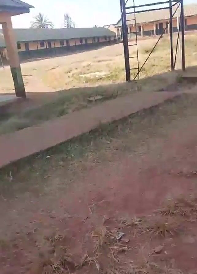 dusty, brown-red field or yard. There is sparse dry grass and other vegetation. In the background, a series of low, long buildings with green roofs can be seen. A metal structure, possibly a tower or frame, stands near the foreground. The sky is light and bright. The video is shot from a low angle, moving slightly as if someone is walking.