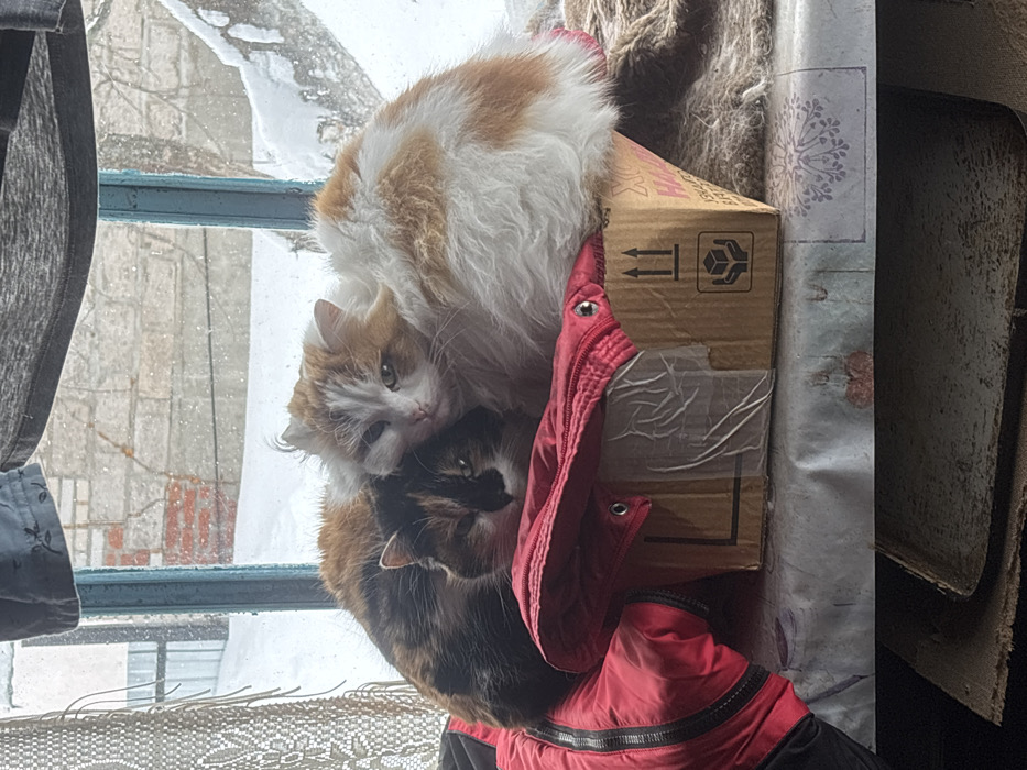 Two felines are resting on a windowsill inside a residence in the city of Прикамский, Russia, during a snowy winter day. A calico cat with black, orange, and white markings is positioned to the left, with its head resting on a folded red zippered jacket. Its eyes are partially closed. Adjacent to and slightly behind it, a long-haired ginger and white cat is curled up, looking towards the viewer with half-closed eyes. Both cats are huddled together. They are situated on top of a brown cardboard box, which features black shipping symbols including upward-pointing arrows and a "handle with care" graphic. The box is secured with clear adhesive tape. Below the box and jacket, the windowsill is covered by a light-colored material with a faint pattern, possibly a tablecloth or linoleum. The window frame is painted light blue. To the left, a white lace curtain is partially visible. Through the window, an exterior scene is observable: snow covers the ground and the branches of trees. In the mid-ground, a light-colored brick building with visible mortar lines stands. The sky appears overcast. The scene is illuminated by natural light entering through the window.