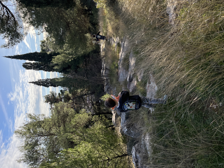 The scene depicts a forested hiking trail within a natural park area in Podgorica, Montenegro. Two children are present on an unpaved, rocky dirt path under a sky with scattered cumulus clouds and bright sunlight. In the immediate foreground, a young child, viewed from behind, stands on a patch of ground with exposed rocks and dry grass. The child wears a dark long-sleeved shirt featuring a white graphic print on the back with text including "ADVENTURE LET'S GO ON A..." and "MORITZ Holidays." They are also wearing patterned grey trousers and light-colored athletic shoes. The child holds an orange toy, resembling a blaster or dart gun, in both hands, pointing it forward. Further along the winding path, approximately 10-15 meters ahead and to the right, a second child, also seen from behind, is in motion. This child wears dark clothing and appears to be running or quickly walking down the trail, with their right leg raised mid-stride. The environment is characterized by dense vegetation, primarily tall evergreen trees, including various pines and cypress trees, which form a thick canopy and line the path. The ground is rugged, covered with exposed grey rocks of various sizes, dry, tall grasses, and some patches of greener undergrowth. The sunlight casts shadows, indicating a clear, bright day.