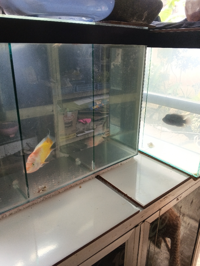This image, taken in Sarandi de Cuadra, Uruguay, depicts two glass aquariums positioned side-by-side on a white tiled surface. The aquarium on the left contains a single fish, approximately 15-20 cm long, exhibiting a white head and body that transitions to bright orange and yellow on its posterior half. The water within this tank appears slightly murky, and its glass surfaces show visible smudges and residue. Reflections of various objects, including cardboard boxes and a pink bowl, are visible on the back glass panel. The aquarium on the right is positioned slightly behind and to the right of the first, appearing to be in a brighter area. It contains a single dark-colored fish, approximately 10-12 cm long, swimming towards the left. A small, light-colored object, possibly a shell, rests on the tank's bottom. The background visible through this tank's glass is brightly lit and shows indistinct green foliage, suggesting proximity to an outdoor window. Both aquariums rest on a white surface composed of multiple rectangular tiles with dark grout lines, which in turn sits atop a light-colored wooden or laminate structure with darker brown edges. Below this structure, reflections or internal components are visible through what appear to be glass panels. Above the left aquarium, a light blue, ceramic-like bowl is partially visible, along with a dark, irregular object and a dark fabric surface. The scene is brightly lit, with strong light coming from the right, creating reflections on the glass surfaces. No individuals are present in the scene.