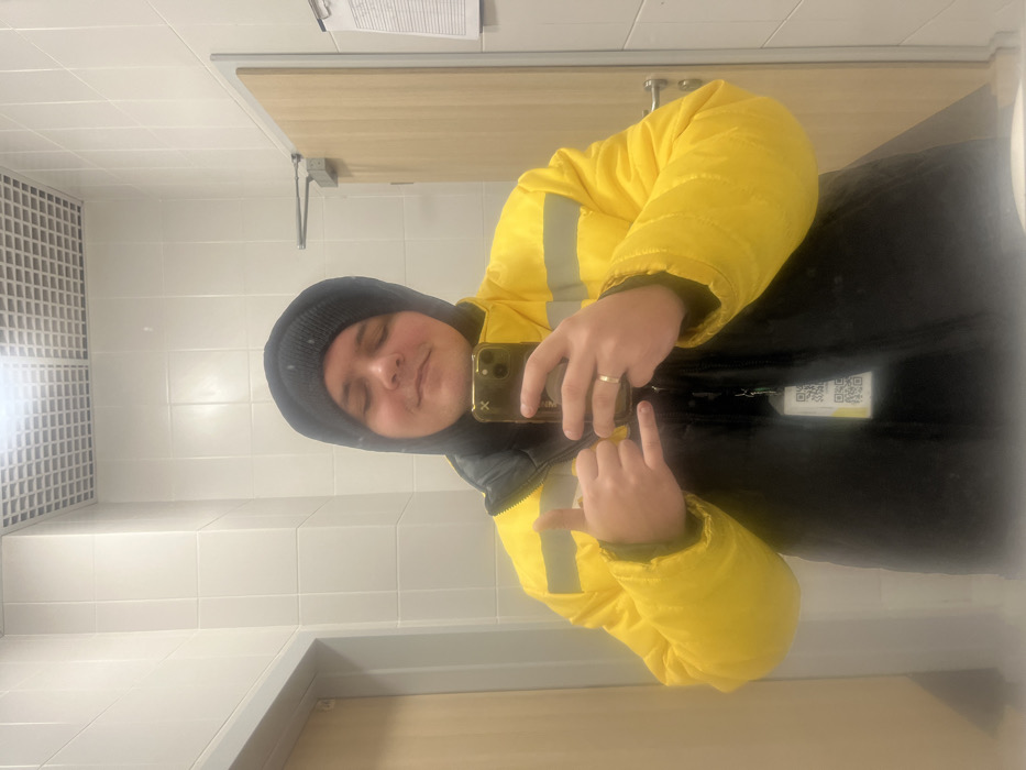 An individual is depicted in a full-frame selfie, reflected in a mirror, within an interior space in Lupanovo, Russia. The male subject, of apparent light complexion, is captured from the chest up. He wears a dark grey knit beanie, a black hooded garment, and a prominent yellow and black puffer jacket featuring grey horizontal reflective strips across the chest. His eyes are closed, and a slight smile is present on his face. He holds a smartphone with a gold-toned case in his left hand, which appears to be the device used to capture the image. On his right hand, a simple gold-colored band ring is visible on the ring finger, and he displays a "shaka" hand gesture (thumb and pinky extended). An identification badge with two visible QR codes on a white background is suspended from his neck by a lanyard, partially obscured by the phone. The environment features white tiled walls, a metal grate ceiling vent, and a light-colored wooden door with a silver handle and a hydraulic closer mechanism on the right. A white clipboard containing a document is affixed to the right wall or door. A second door is partially visible on the left. The reflective surface shows minor imperfections or smudges.