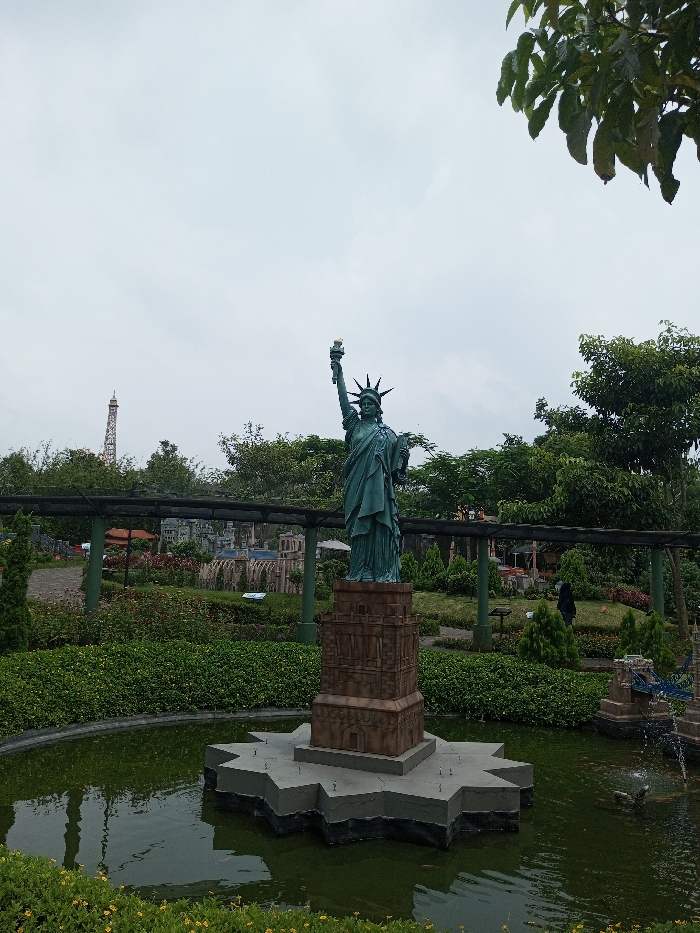 This image captures an outdoor park scene in Ciherang, Indonesia, under an overcast sky. A miniature replica of the Statue of Liberty, rendered in verdigris green, stands prominently on a brown pedestal. This pedestal is situated on a gray, star-shaped platform within a circular pond containing dark green water. The statue holds a torch in its raised right hand and a tablet in its left. In the far background to the left, a miniature Eiffel Tower is visible above a line of trees. The mid-ground features a dark trellis system spanning horizontally across the scene, beneath which various miniature European-style buildings and landscaped garden beds are arranged. A single individual, dressed in dark clothing, is observed walking on a path among the greenery to the right of the Statue of Liberty. Additional indistinct figures are visible in the distant background. Overhanging green leaves partially obscure the upper right corner of the frame. Yellow flowers line the edge of the pond in the lower left foreground. A small water feature with a spout is present in the pond to the right of the statue's base.