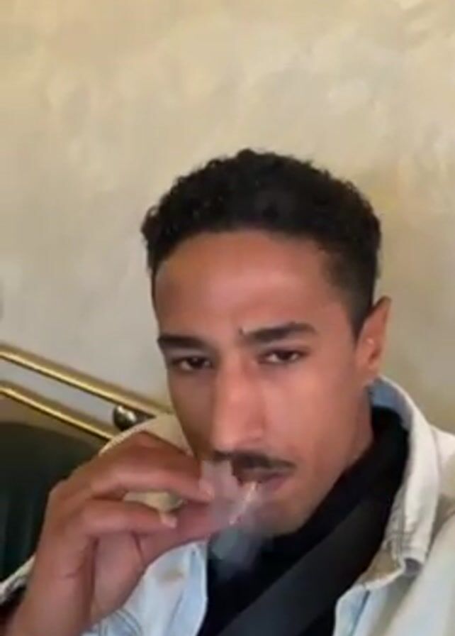 A man with curly hair, a mustache, and brown skin is holding a lit cigarette in his mouth. He is wearing a black shirt with the word "Believe" on it, and a denim jacket. He takes a drag and exhales smoke towards the camera. The background is a beige wall with a gold-colored picture frame and an electrical outlet. There are green chairs behind him.