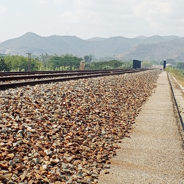 A train track stretches into the distance, with coarse, angular gravel surrounding the rails