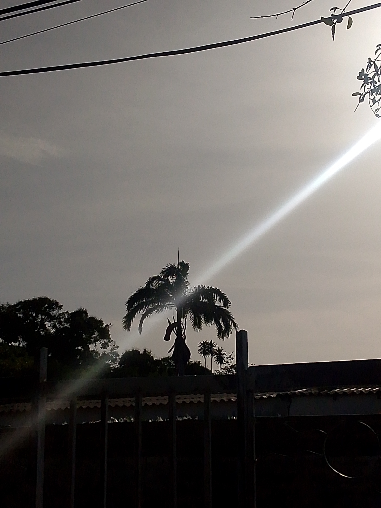 A low-angle shot of a silhouette of a palm tree against a bright, sunlit sky. The tree is partially obscured by a fence and the roof of a building. Power lines are visible in the upper portion of the frame. Other trees and vegetation are in the background. The location is Juan Griego, Venezuela.