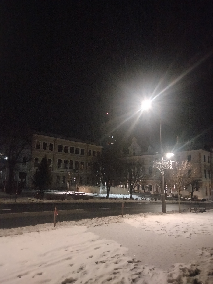 A snowy night scene features large buildings illuminated by streetlights. One prominent light casts a strong glare with rays extending outwards. Snow covers the ground in the foreground. Bare trees stand between the road and the buildings. The road is dark and possibly wet. The sky is dark.